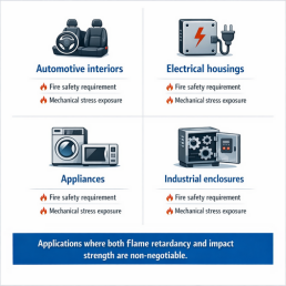 In applications such as automotive interiors, appliance housings, electrical enclosures and consumer goods, this trade-off was unacceptable. Fire safety could not come at the cost of durability.